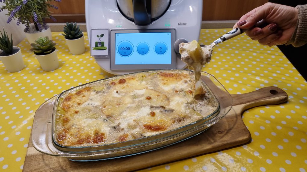 Mettere nel boccale l’olio, l’aglio e far insaporire per 4 minuti a 120 gradi a velocità 1, al termine togliere l’aglio dal boccale. Unire i funghi, il sale, il pepe e far cuocere per 10 minuti a 100 gradi con l’antiorario a velocità soft. Aggiungere la salsiccia e far cuocere per 5 minuti a 100 gradi con l’antiorario a velocità soft. Versare il composto nella ciotola con le patate, unire la panna, il parmigiano ed amalgamare bene con la spatola. Trasferire il composto in una pirofila da forno unta con olio, mettere sopra la panna a cucchiaiate, il parmigiano e cuocere in forno preriscaldato a 180 gradi per 30 minuti. Terminata la cottura, lasciare intiepidire e servire.