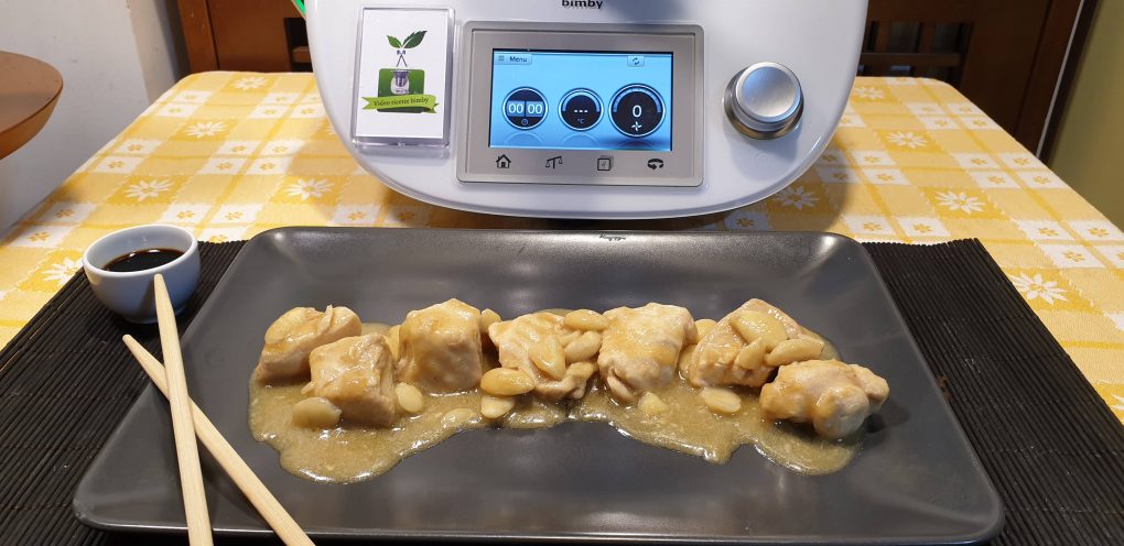 Mettere nel boccale lo scalogno e far tritare per 3 secondi a velocità 7, al termine riunire sul fondo del boccale con la spatola. Unire il resto dell’olio, lo zenzero e far insaporire per 3 minuti a 120 gradi a velocità 4. Posizionare la farfalla sulle lame. Unire i bocconcini di pollo e far insaporire per 3 minuti a 100 gradi con l’antiorario a velocità soft. Unire l’acqua, il dado vegetale e far cuocere per 14 minuti a 100 gradi con l’antiorario a velocità soft. Unire le mandorle, la salsa di soia, un pizzico di sale (se necessario) e far cuocere per 5 minuti a 100 gradi con l’antiorario a velocità soft. Ultimata la cottura, impiattare e servire.