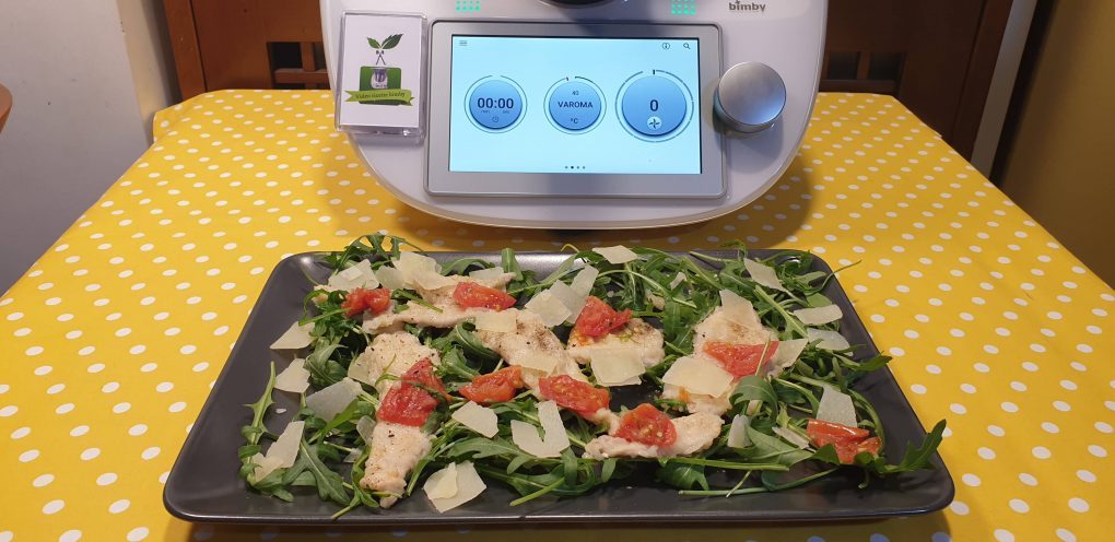 Trascorso il tempo togliere il succo di limone, infarinare gli straccetti di pollo e posizionarli nel varoma. Aggiungere i pomodorini, il sale, il pepe, l’olio. Mettere nel boccale l’acqua, chiudere con il coperchio, posizionare il varoma e far cuocere per 25 minuti a temperatura varoma a velocità 2. Al termine unire una parte della rucola e far proseguire la cottura per 3 minuti a temperatura varoma a velocità 2.