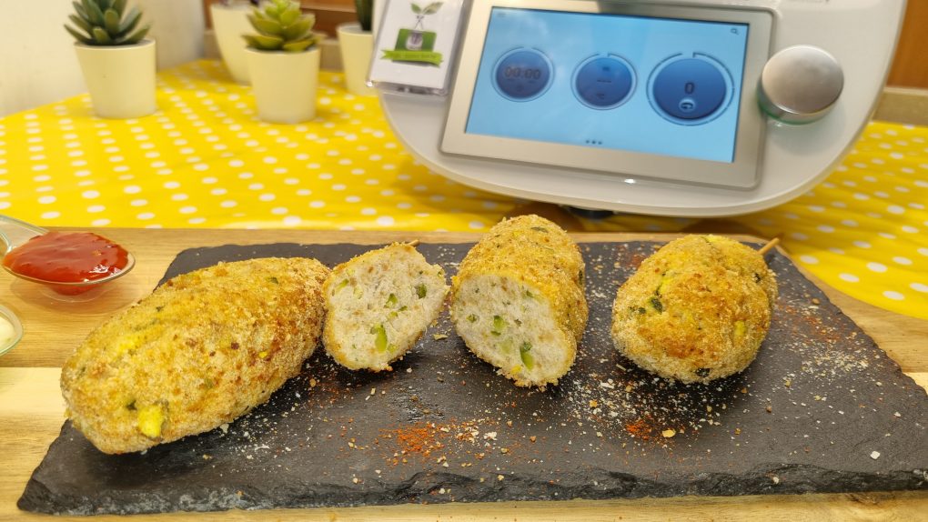 Prendere una parte del composto e formare delle polpette allungare, inserire uno spiedino per ogni polpetta allungata, passarle nel pangrattato e posizionarle su una teglia rivestita con carta da forno. Irrorare con un filo d’olio e cuocere in forno preriscaldato statico a 200 gradi per 25-30 minuti.