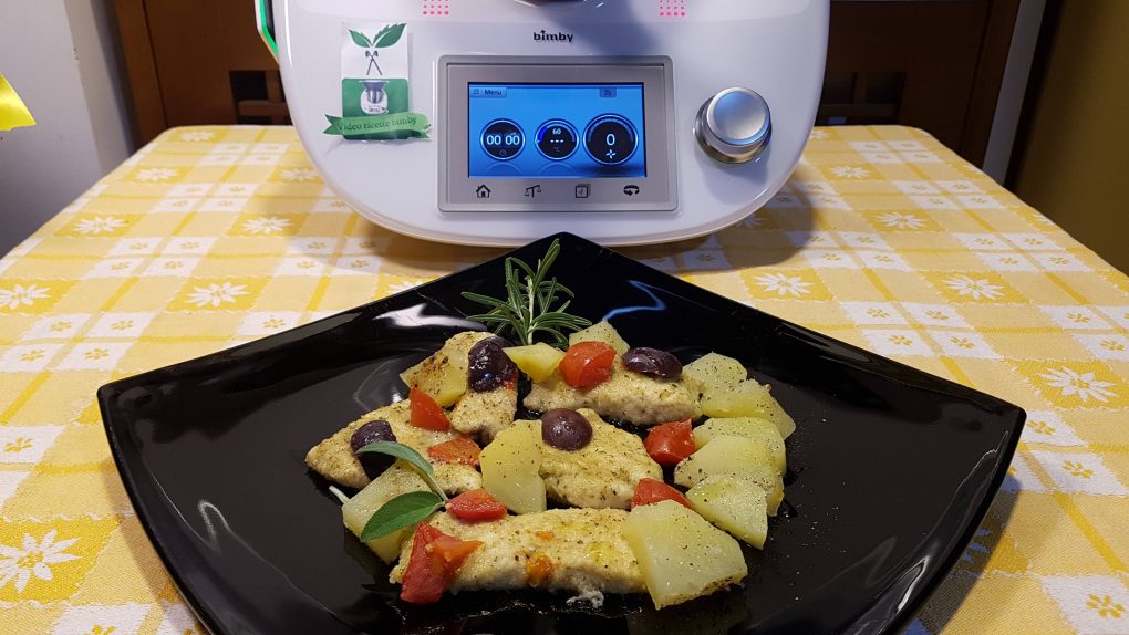 Tagliare il pollo a tocchetti, passarlo nel trito e posizionarlo nel varoma e nel vassoio del varoma rivestiti con carta da forno bagnata e strizzata. Aggiungere i pomodorini tagliati a pezzetti, le olive e condire con olio, sale e pepe. Mettere le patate nel cestello e condire con sale e pepe.