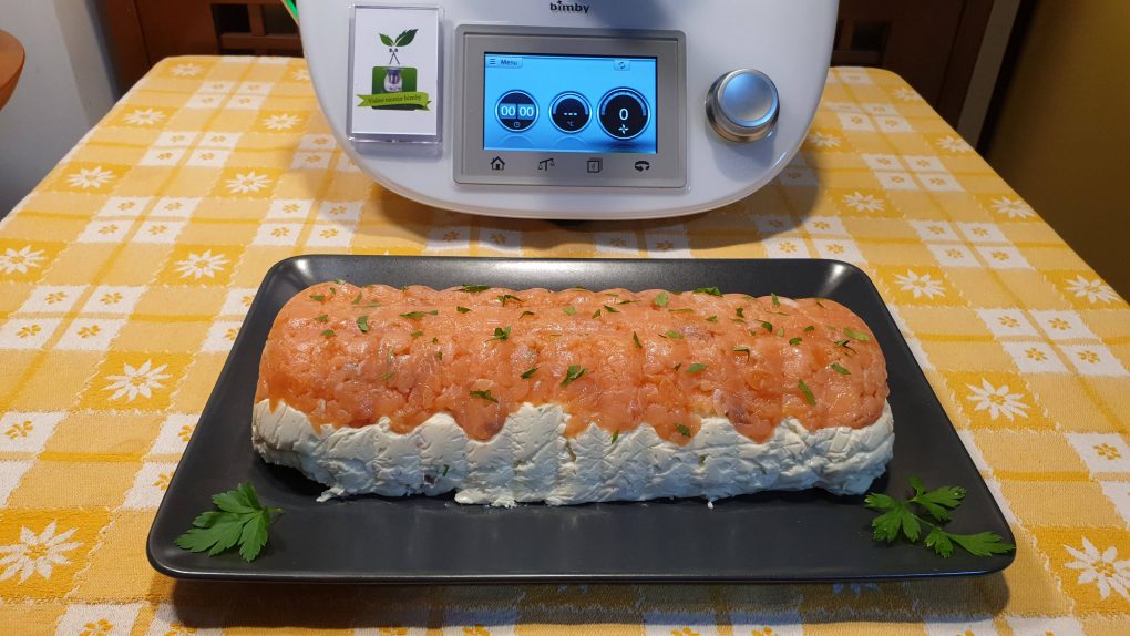 Rivestire uno stampo da plumcake da 25 cm con pellicola trasparente, mettere sul fondo 180 g di salmone tagliato a pezzetti e livellare bene. Versare sul salmone il composto del boccale, livellare bene, coprire con pellicola trasparente e riporre in frigo per circa 4 ore.