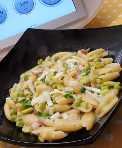 Pasta con fave piselli e pancetta