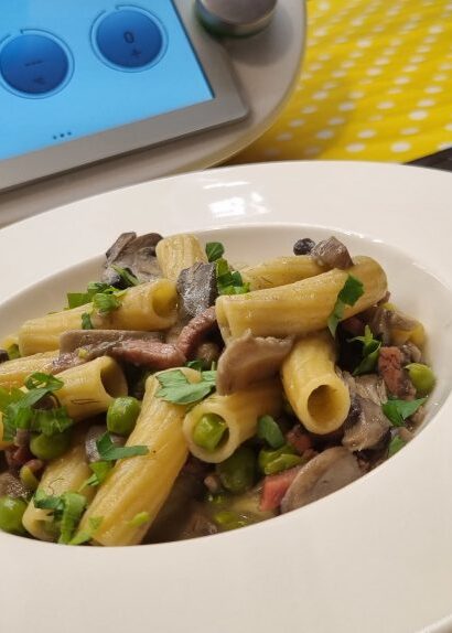 Pasta piselli speck e funghi