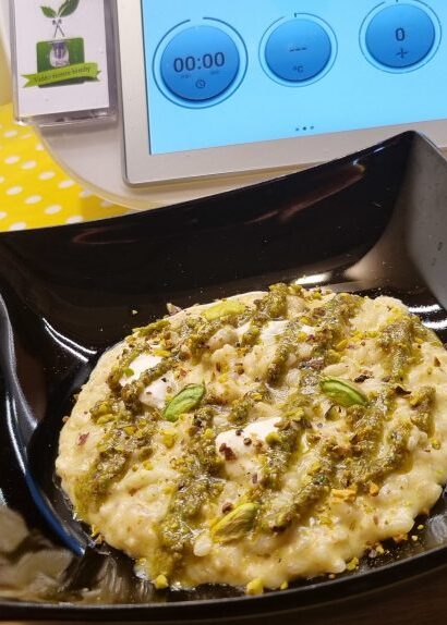 Risotto al pesto di pistacchi, burrata e gamberetti
