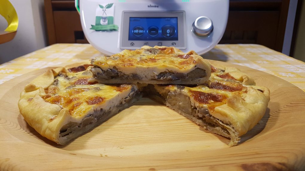 Iniziamo la ricetta mettendo nel boccale i carciofi, i funghi, l’olio e far cuocere per 10 minuti a 100° con l’antiorario a velocità 1. Aggiungere il prezzemolo tritato, il sale, il pepe e far amalgamare per 3 minuti a 100° con l’antiorario a velocità 1. Stendere la pasta brisée, distribuire sopra il ripieno di carciofi e funghi.
