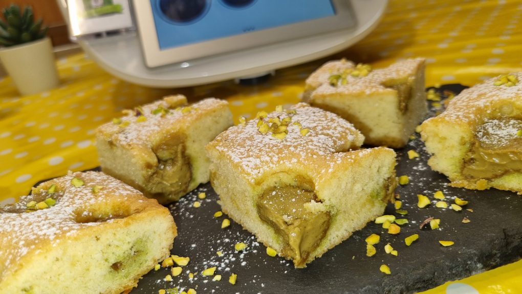 Terminata la cottura, lasciare raffreddare completamente prima di rimuovere dallo stampo, tagliare a quadrotti, spolverizzare con zucchero a velo e granella di pistacchi.