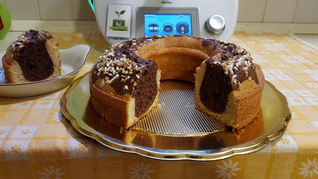 Iniziamo la ricetta mettendo nel boccale le uova e lo zucchero e far montare per 5 minuti a 37 gradi a velocità 4. Aggiungere la panna, l’olio, la farina, il lievito, la vanillina e far amalgamare per 1 minuto e 30 secondi a velocità 4. Versare metà del composto in uno stampo a ciambella del diametro di 26 cm ben imburrato e tenere da parte.