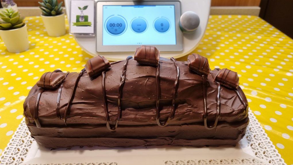 Nel frattempo preparare la crema. Mettere nel boccale il mascarpone, la crema nutkao ed azionare il bimby per 1 minuto a velocità 3, mettere da parte. Dividere in due parti il plumcake, scavare la parte centrale e riempirla con la crema, mettere due barrette kinder bueno e chiudere. Glassare il plumcake con il cioccolato fondente fuso e lasciare indurire. Decorare con la crema al cioccolato fondente o la nutella e le barrette kinder bueno.