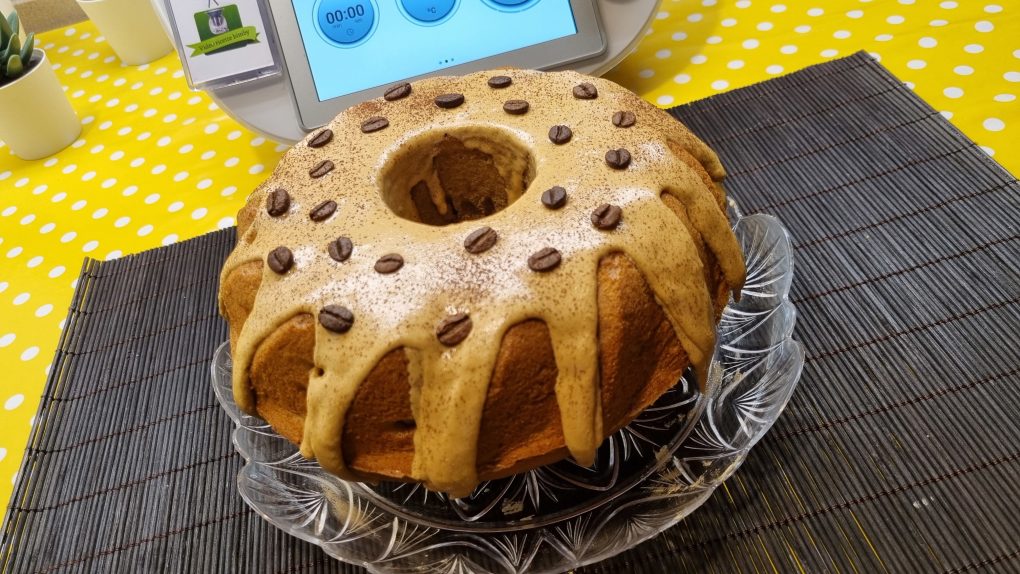 Nel frattempo preparare la glassa. Mettere nel boccale lo zucchero e far polverizzare per 10 secondi a velocità 10, riunire sul fondo del boccale con la spatola. Unire il caffè ed azionare il bimby per 30 secondi a velocità 3. Versare la glassa sulla superficie del torta e servire.