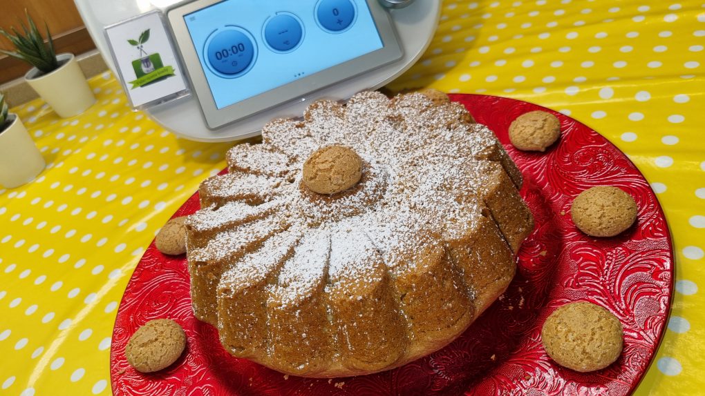 Mettere nel boccale gli amaretti e tritare per 10 secondi a velocità 7, al termine mettere da parte. Mettere nel boccale lo zucchero, le uova ed azionare il bimby per 5 minuti a 37 gradi a velocità 4 senza misurino. Unire l’olio, la farina, la fecola, il sale ed azionare il bimby per 2 minuti a velocità 5. Aggiungere il lievito, l’amaretto di Saronno, gli amaretti messi da parte e far amalgamare per 50 secondi a velocità 5. Trasferire il tutto in uno stampo da 22-24 cm di diametro ben imburrato. Cuocere in forno preriscaldato statico a 180 gradi per 40-50 minuti circa, fare sempre la prova stecchino per verificare la cottura. Terminata la cottura, lasciare raffreddare completamente prima di rimuovere dallo stampo e servire spolverizzando con zucchero a velo.
