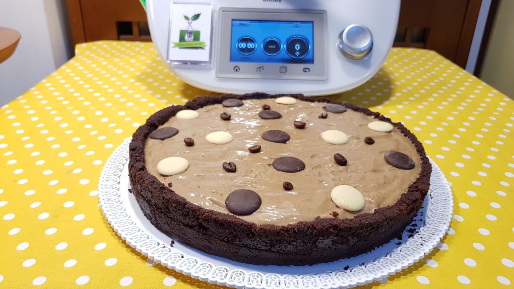 Riprendere la base di biscotti, versare la crema, livellare e riporre in frigo per almeno 3 ore prima di servire. Decorare con bottoncini di cioccolato e chicchi di caffè.