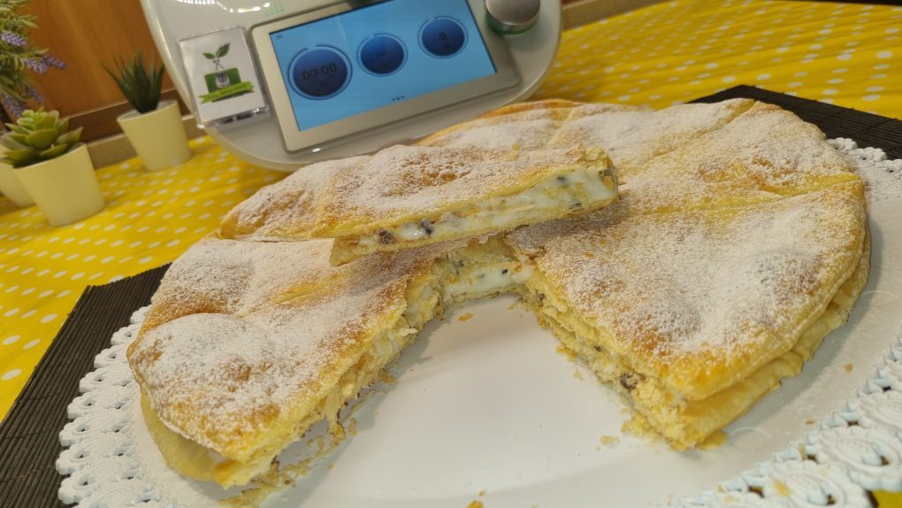 Trascorso il tempo, prendere la prima sfoglia e posizionarla su di un piatto da portata, mettere la crema di ricotta e livellare bene. Posizionare sopra l’altra sfoglia, spolverizzare con zucchero a velo e servire.