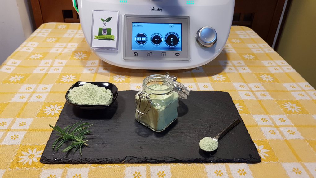 Iniziamo la ricetta mettendo nel boccale l’aglio, il rosmarino, la salvia, l’alloro, l’origano, il prezzemolo, il basilico, il sale e far polverizzare per 1 minuto da velocità 6 a velocità 10. Trasferire su una teglia rivestita con carta da forno e far asciugare in forno preriscaldato statico a 50 gradi per 25 minuti. Trascorso il tempo, trasferire in vasetti di vetro con chiusura ermetica.