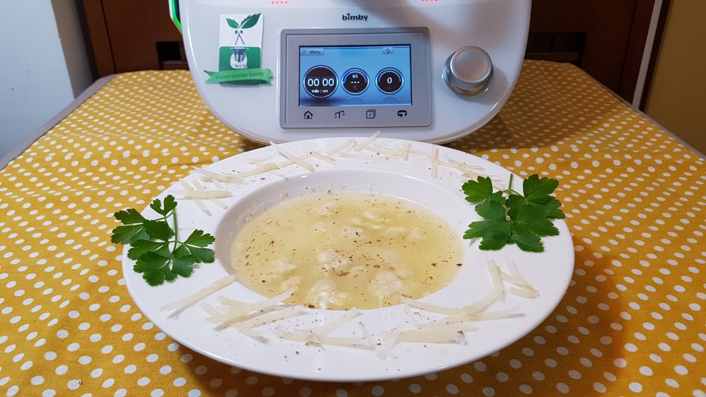 Mettere nel boccale il prezzemolo ed il parmigiano e tritare per 10 secondi velocità 8. Aggiungere le uova, il sale, la noce moscata, il pepe ed amalgamare per 20 secondi a velocità 3, al termine mettere da parte in una ciotola o caraffa. Lavare il boccale, mettere nel boccale l’acqua ed il dado di carne bimby e far cuocere per 12 minuti a 120° a velocità 1. Azionare il bimby per 2 minuti a 80° con l’antiorario a velocità 2 e versare dal foro del coperchio il composto di uova precedentemente messo da parte. Versare in una zuppiera e servire con il parmigiano e la noce moscata.